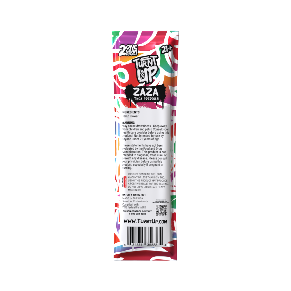 Our Turnt Up Zaza THCA Pre-Rolls are meticulously hand-rolled to ensure even burning and consistent potency. Infused with the rich and distinctive flavor, these prerolls provide a delightful sensory experience with every puff. Now includes crushed THC-A diamonds within each preroll for extra potency.